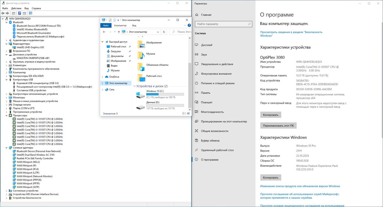 Процессор: Intel Core i3-10105T — современный, энергоэффективный и достаточно мощный для повседневной работы, офисных приложений и многозадачности