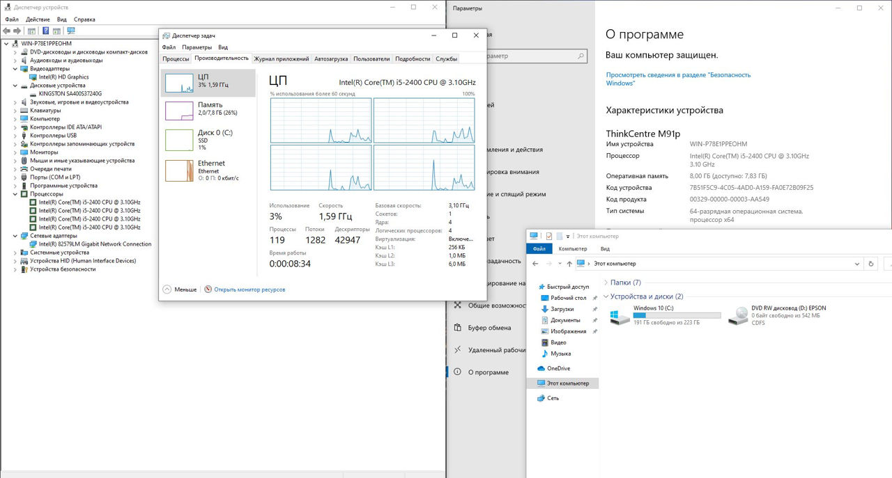 Lenovo ThinkCentre M91p с процессором Intel Core i5-2400 и конфигурацией 8GB (2x4GB) RAM и SSD 240GB представляет собой офисный настольный ПК с хорошей производительностью для работы с повседневными задачами и офисными приложениями