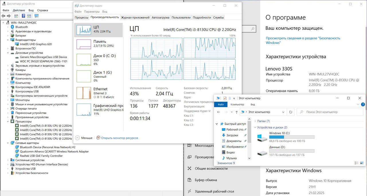 • Процессор: Intel Core i3-8130U — 2 ядра / 4 потока, энергосберегающий и достаточный для повседневных задач